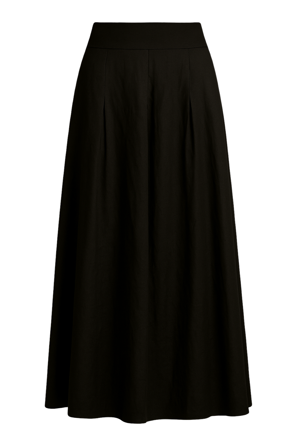 Confectionnée à la main en 100 % lin naturel, cette jupe longue se distingue par sa coupe architecturale et son tombé fluide. La taille haute est parfaitement ajustée, soulignée par deux plis plats qui sculptent la silhouette et offrent un volume subtil, sans excès.